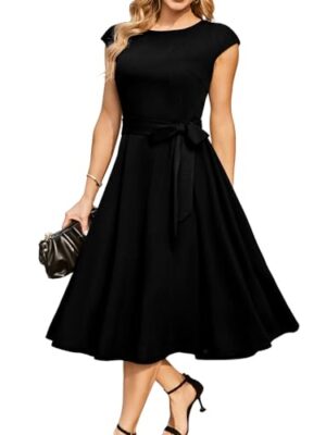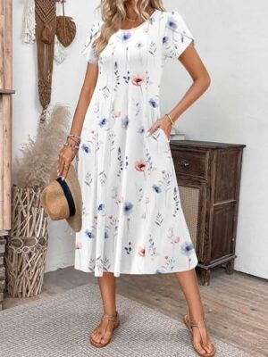 AUSELILY Women’s Short Sleeve Summer Dress Pleated Loose Swing Knee Length Dresses with Pockets 2025 New